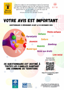 Ce questionnaire est destiné à toute famille habitant une commune du Pays de Sommières : donnez votre avis et partagez vos suggestions sur la petite enfance, l’enfance, la jeunesse, le handicap, la parentalité, l’accès aux droits, le numérique, la culture, la mobilité.