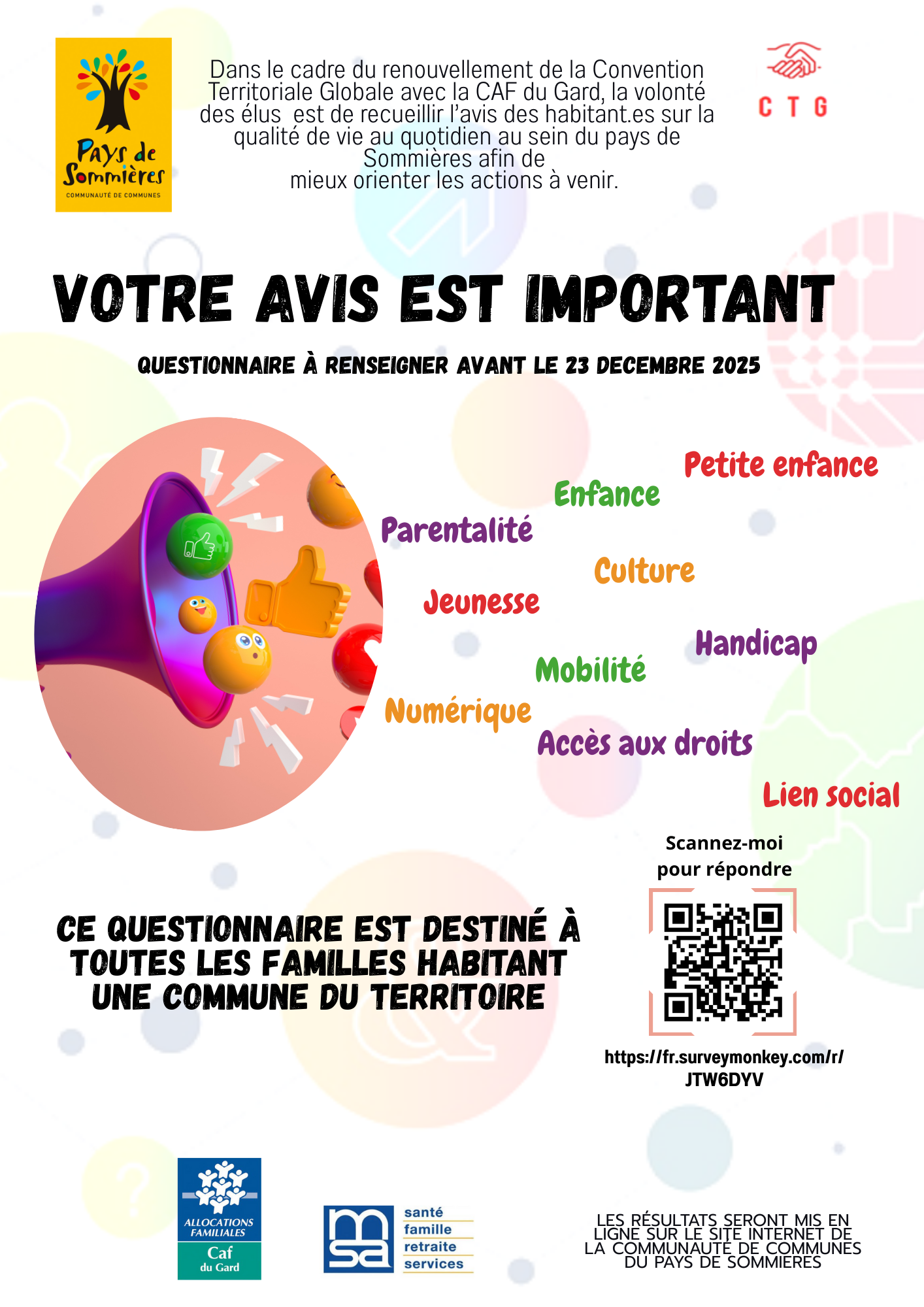 Dans le cadre du renouvellement de la Convention Territoriale Globale avec la CAF du Gard, la volonté des élus est de recueillir l’avis des habitant.es sur la qualité de vie au quotidien au sein du pays de Sommières afin de mieux orienter les actions à venir.